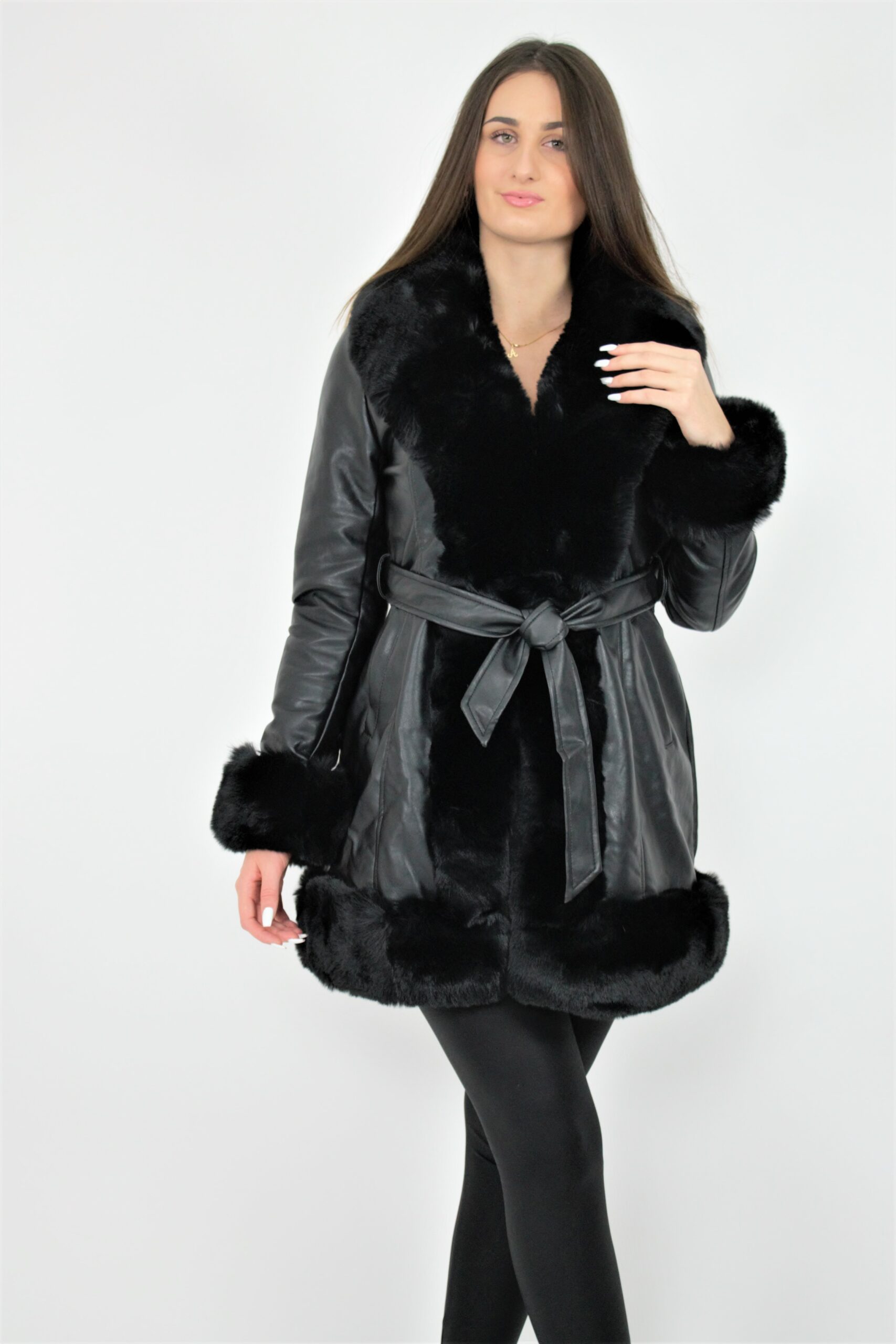 Dieser schöne halb-lange Mantel ist aus einer beige Leder Optik. Es hat einen Kunstpelzkragen. An der Vorderseite ist einen Hakenverschluss. Die Jacke läuft nach unten weiter aus. Hier befindet sich ebenfalls ein Kunstpelzkragen. Auf der Vorderseite hat es zwei schräge Seitentaschen. Da die Jacke mit Webpelz gefüttert ist, trägt sie sich super bequem und sie hält warm!Die Jacke ist mit einem Bauchgurt versehen, mit man verschiedene Möglichkeiten hat es um die Taille zu binden.