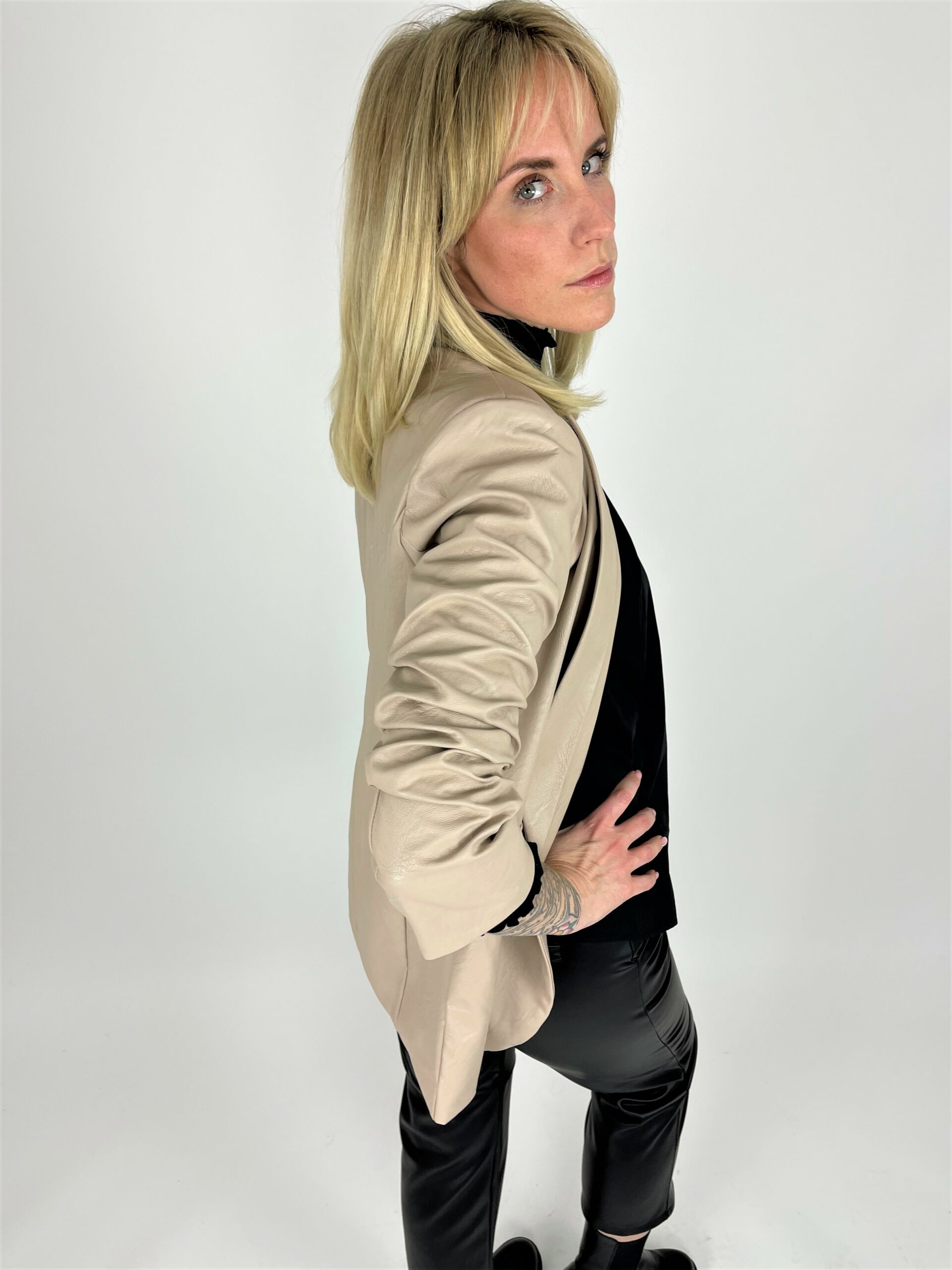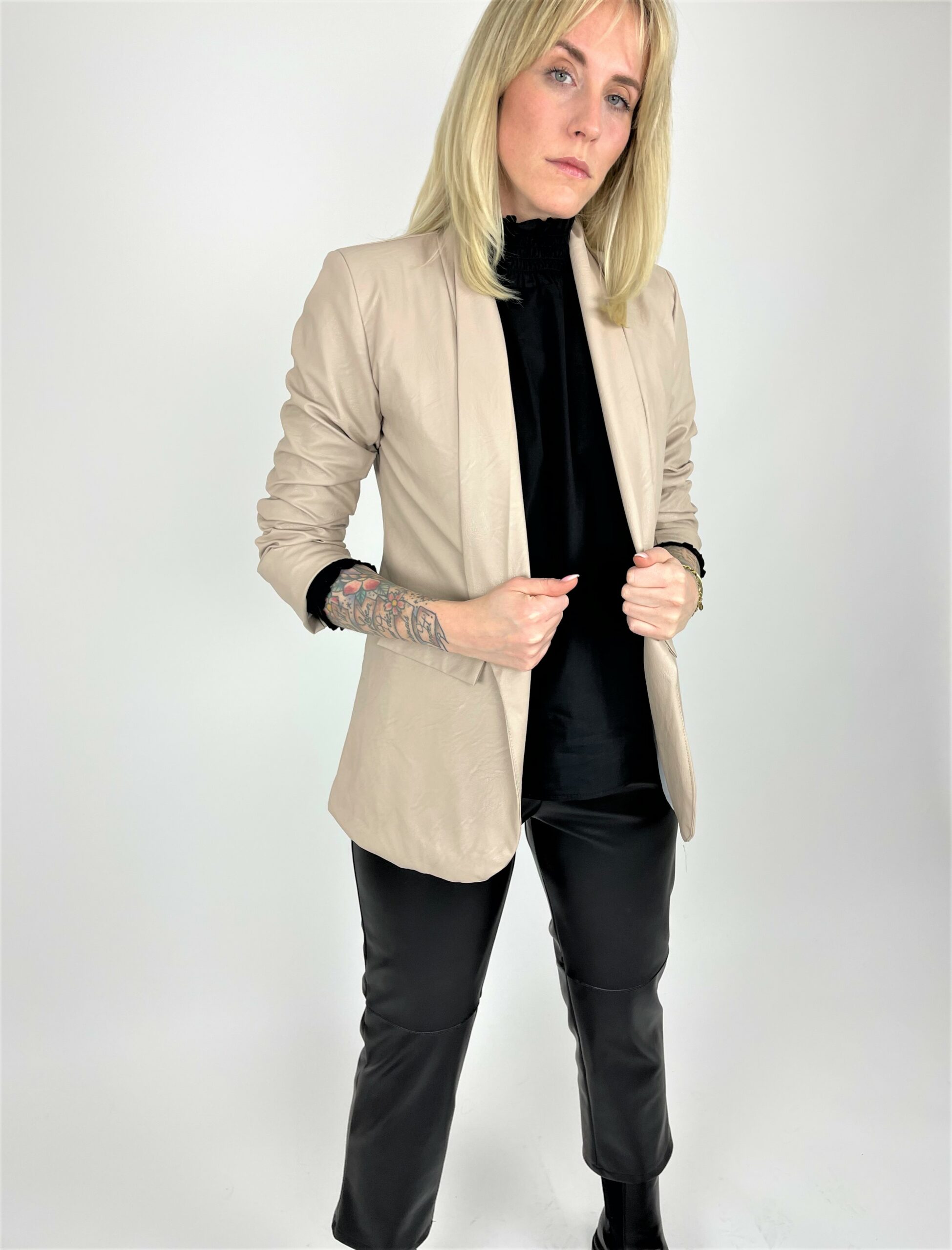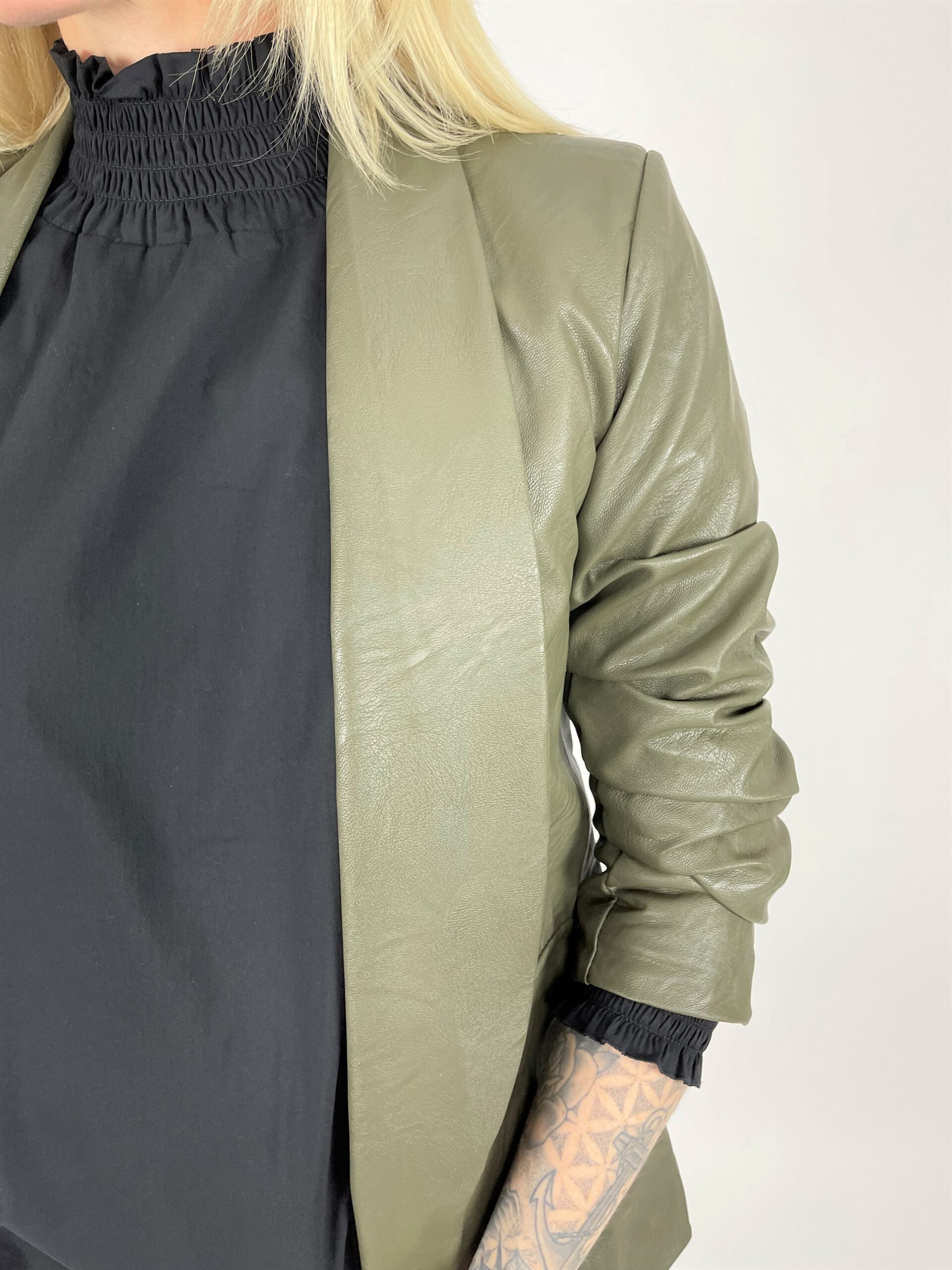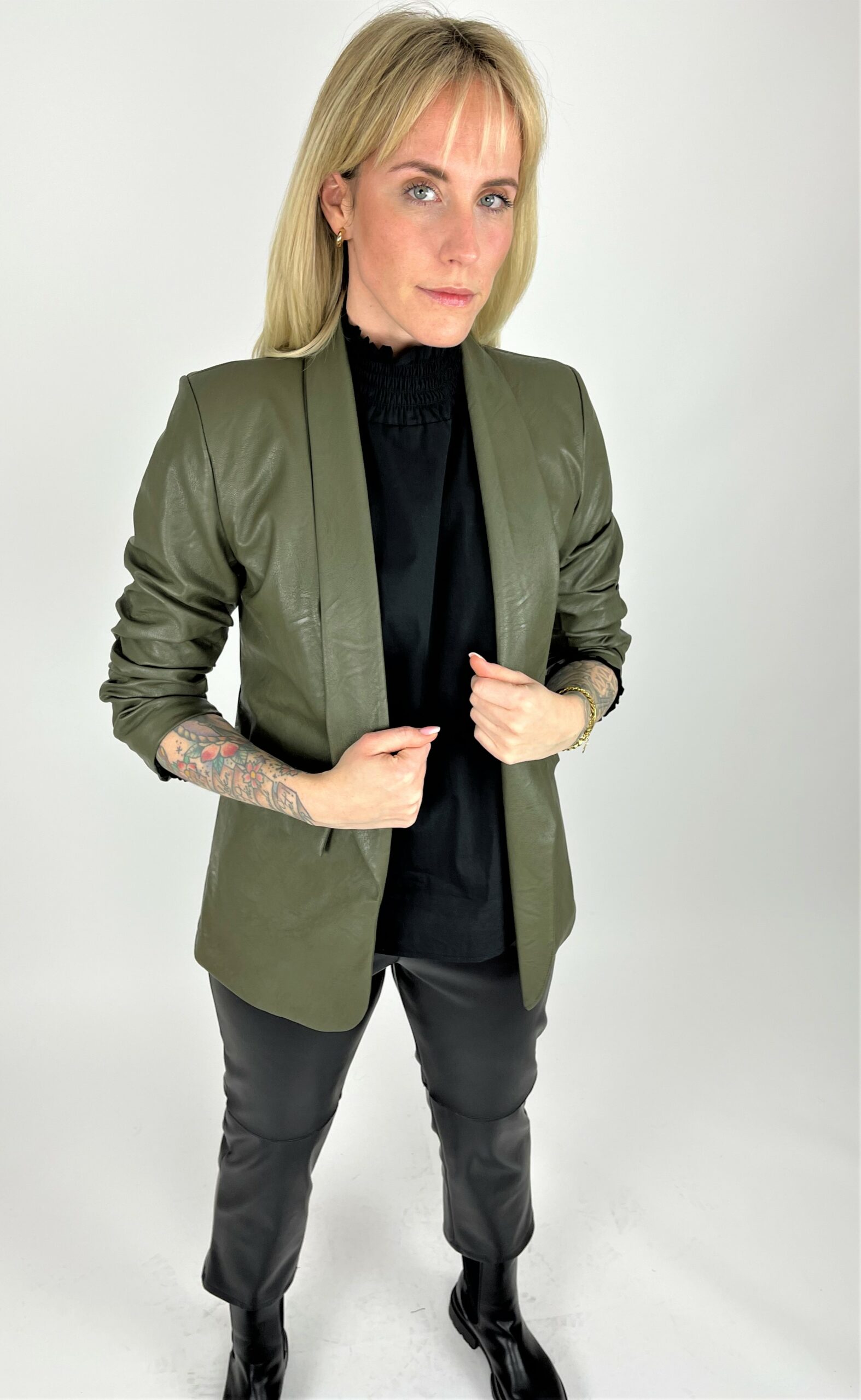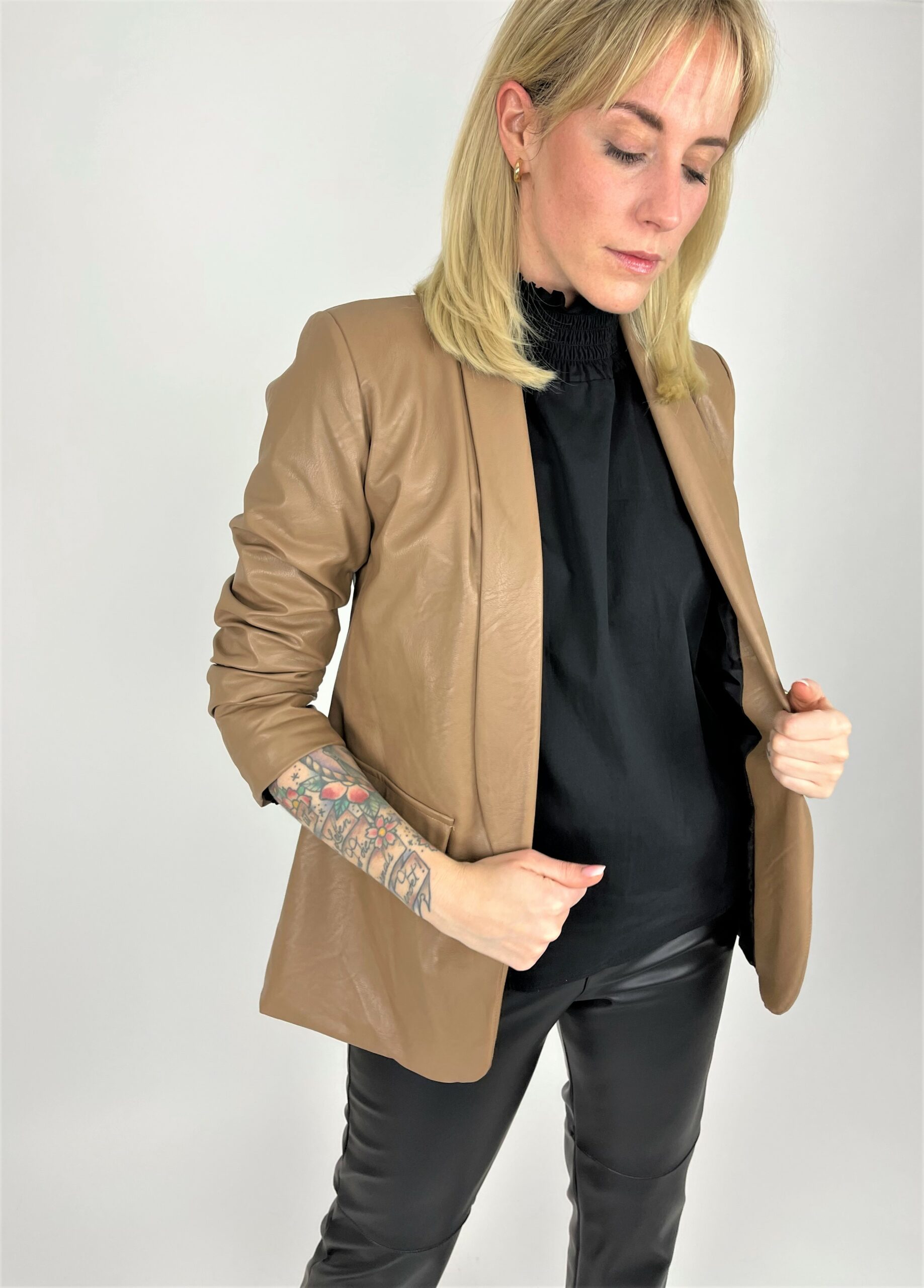 Blazer aus Kunstleder mit Revers, langen Ärmeln, markierten Schultern, vorderen Klappentaschen. Geraffte Ärmel.