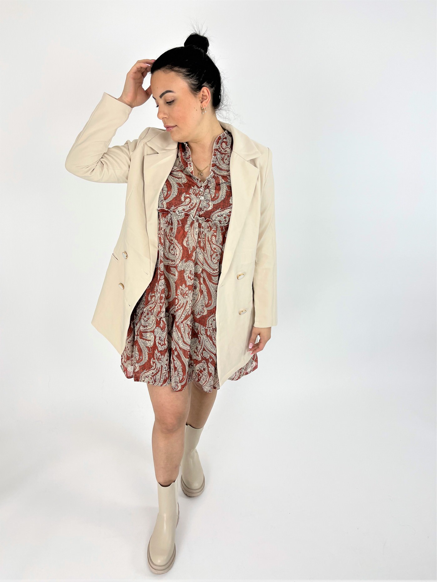 Sommerkleid mit Paisley Muster. Super luftig und leicht. Das Kleid hat ein V-Ausschnitt mir Rüschen. Das Kleid hat ein Untekleid. Gerader Schnitt.