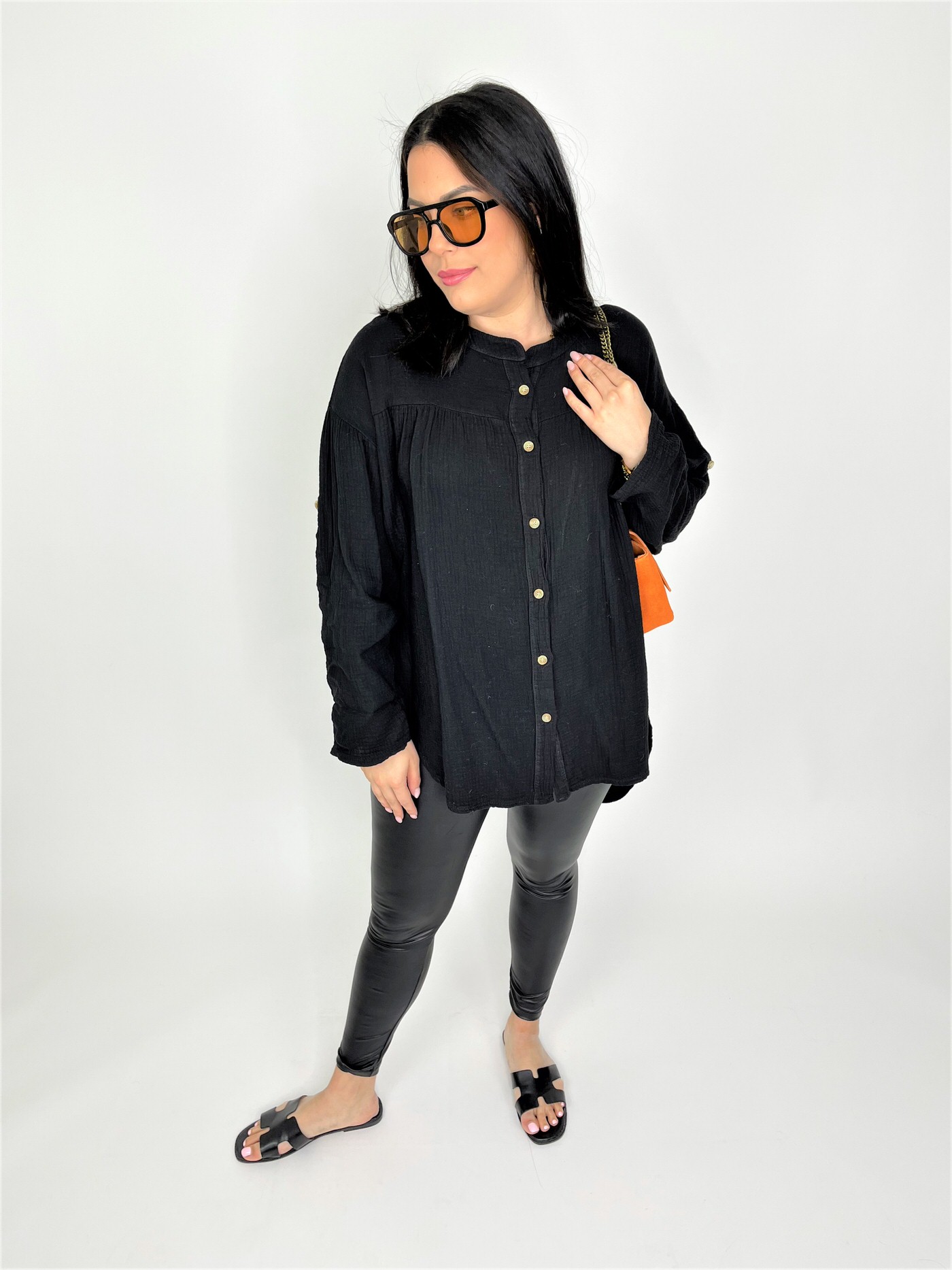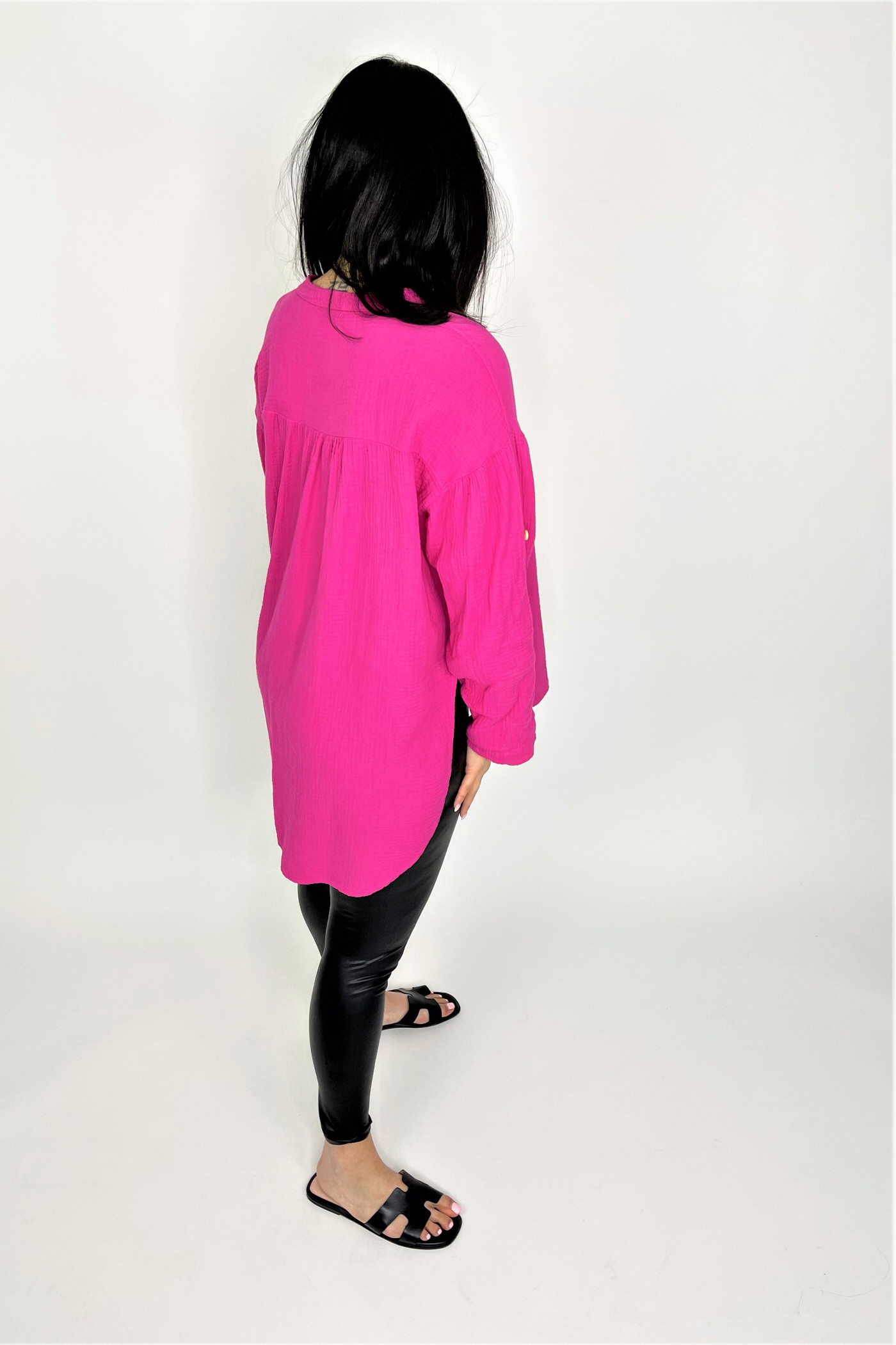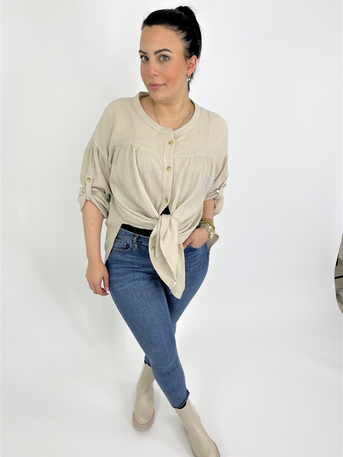 Musselin Hemd in verschiedenen Farben erhältlich, Rundhalsauschnitt mit Knopfleiste, gerade lange Ärmel, die man hochrollen kann und mit einer Schlaufe und einem Knopf als halblang tragen kann. Überschnittene Schultern. Leichte Ballonärmel.