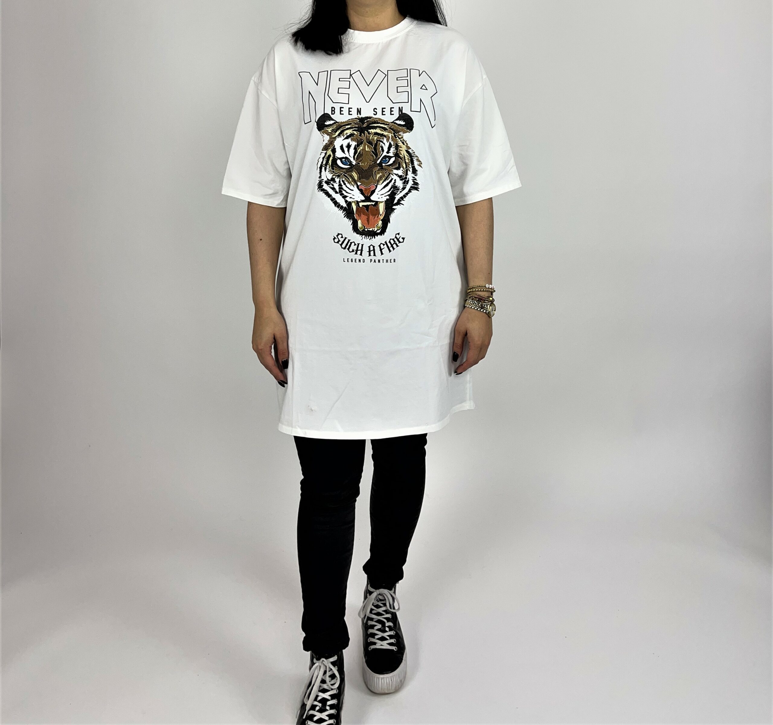 lang geschnitten, kurzärmlig, Rundhals-Ausschnitt, Besonderheit der Löwenkopf als Aufdruck, locker und sportlich tragbar