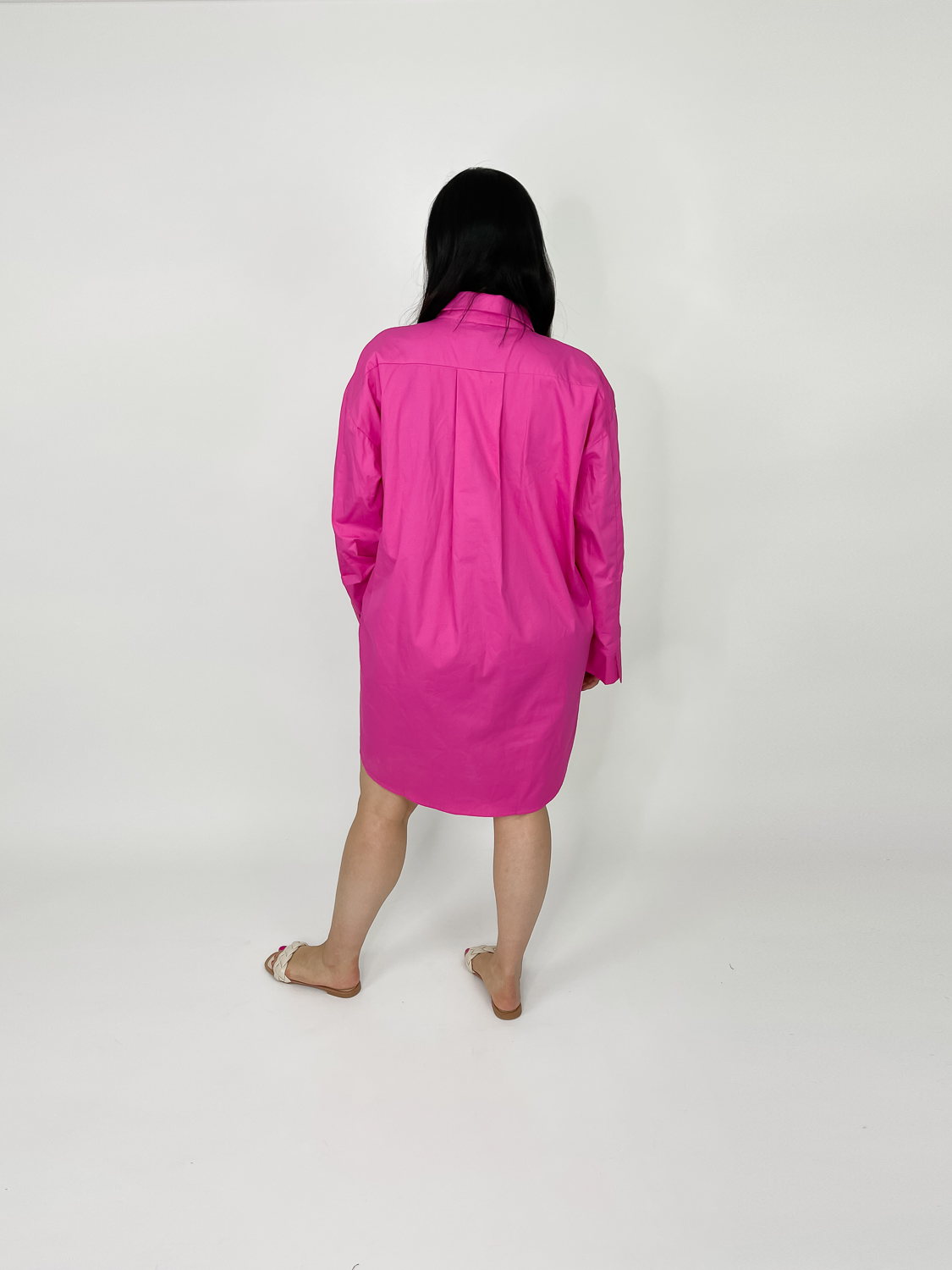 Langes schlichtes Hemdkleid in der Trendfarbe Pink, oversized geschnitten. Auch für Curvy-Girls super geeignet.