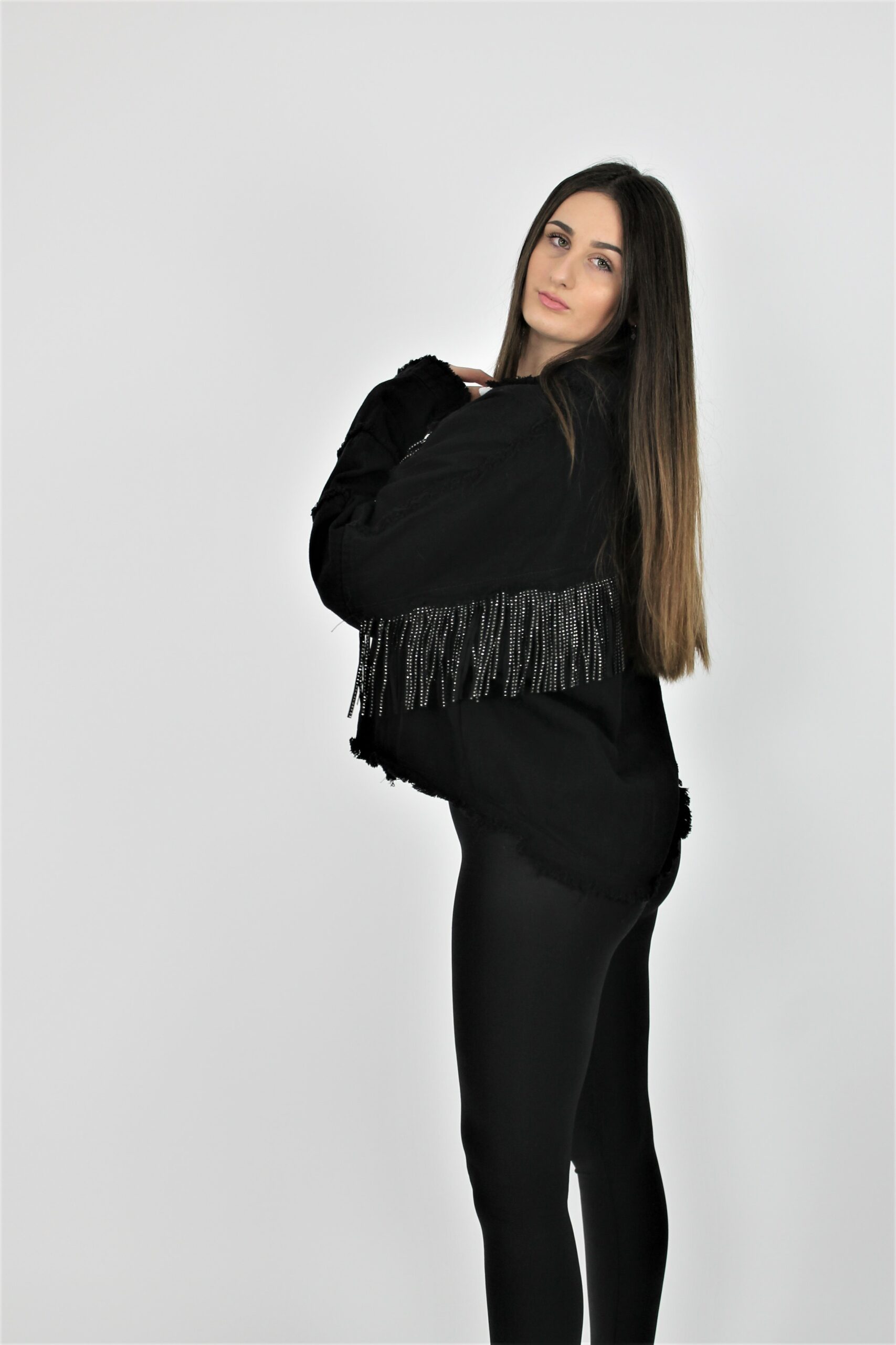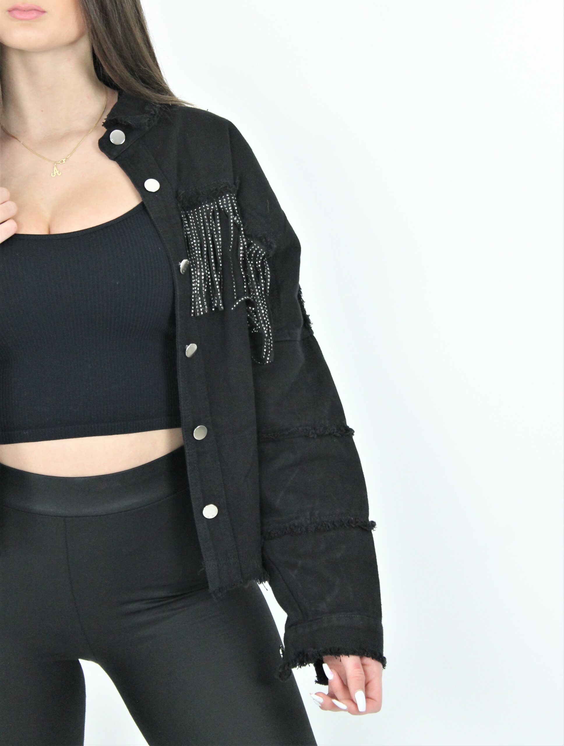 Das Hemd ist am Rand ausgefranst sowie am Kragen und rundherum. Von vorne bis nach hinten ist durchgehend eine Fransenkante. Die Fransenkante hat silberne Glitzersteine. Das Hemd hat überschnitte Schultern.
