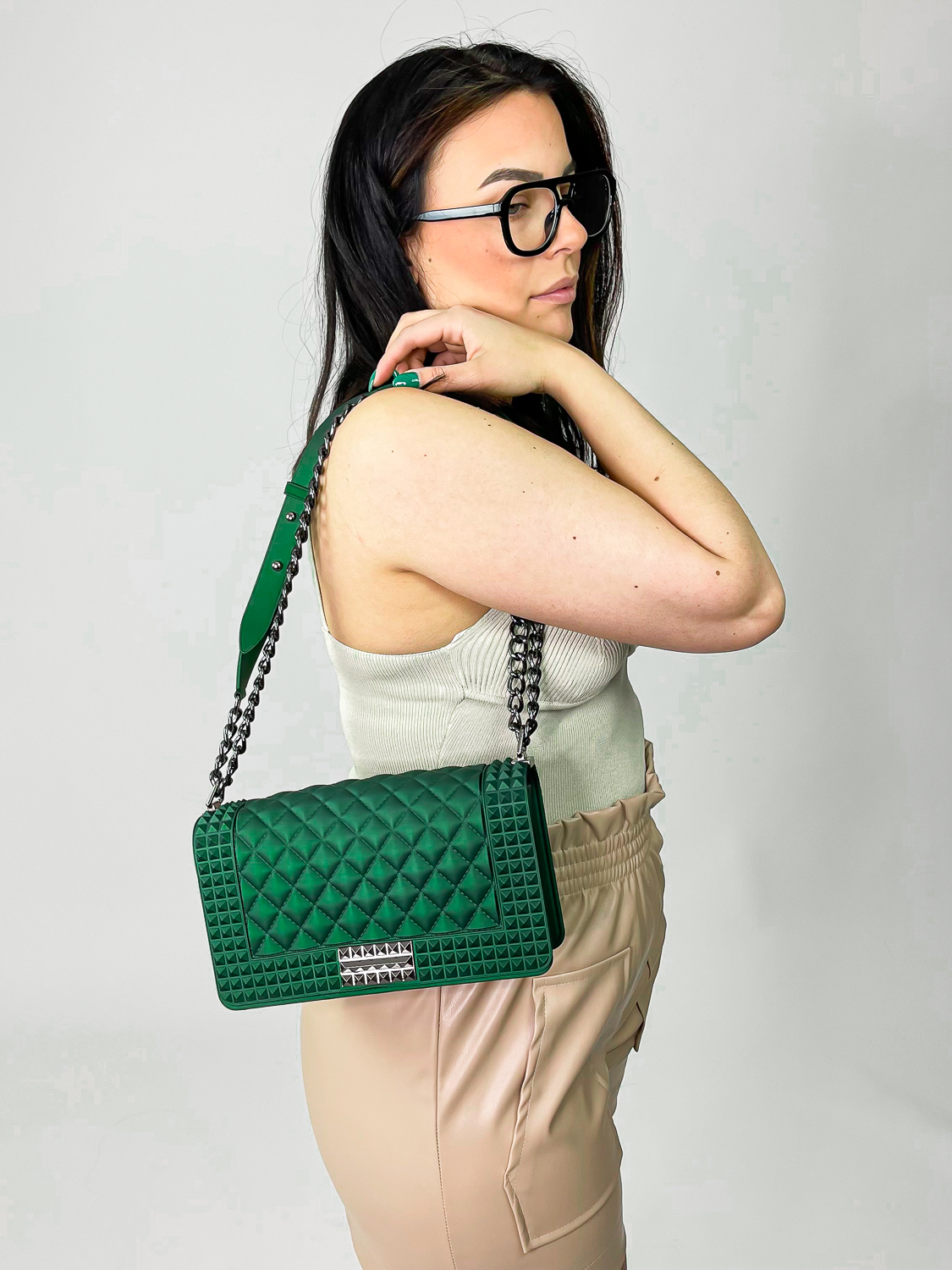 Hochwertige, gesteppte Umhängetasche mit stylischen Nieten im angesagten Smaragdgrün.